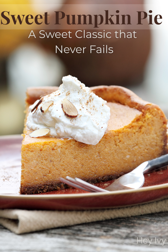 A slice of warm pumpkin pie is cozy and nostalgic, perhaps it’s the smell of the spices, or the time of year we most frequently consume this delicious treat. Nonetheless, there are a lot of deserts to enjoy but this one is a classic favorite and a great choice to bring to your next gathering. Give this one a try and let me know what you think. – Hey Ivy